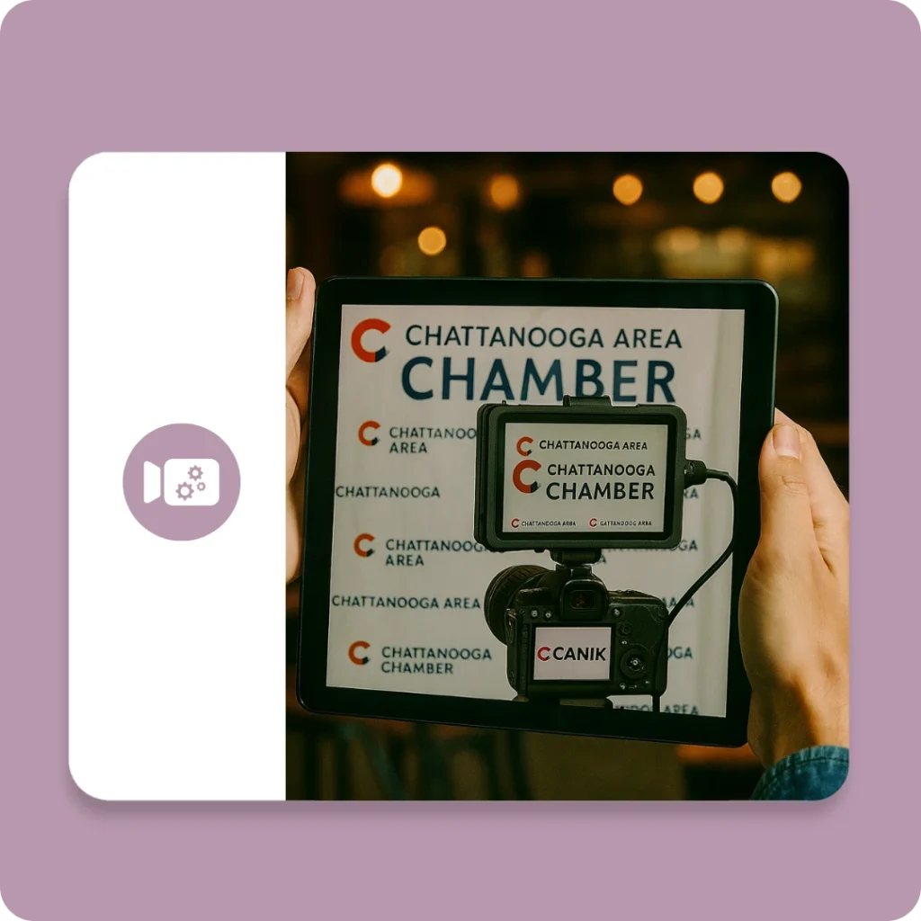 Our alternative uses a mobile camera rig on rails or a gimbal that follows guests along a short runway path. As guests walk, the camera smoothly captures them from multiple angles. After recording, we layer in custom VideoFX, animated overlays, and branding. This setup feels like your own Vogue video shoot—streamlined for any Chattanooga event.